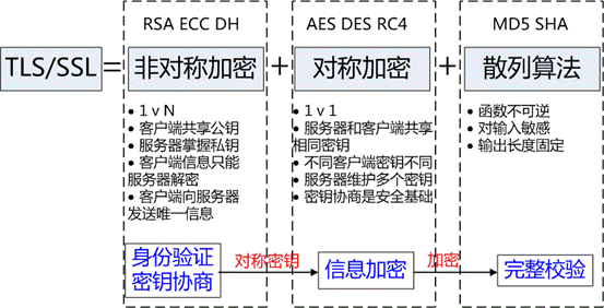 TLS/SSL 的功能實(shí)現(xiàn)主要依賴于三類基本算法:散列函數(shù) Hash、對(duì)稱加密和非對(duì)稱加密,其利用非對(duì)稱加密實(shí)現(xiàn)身份認(rèn)證和密鑰協(xié)商,對(duì)稱加密算法采用協(xié)商的密鑰對(duì)數(shù)據(jù)加密,基于散列函數(shù)驗(yàn)證信息的完整性。