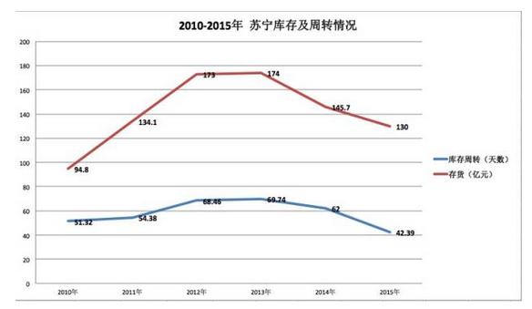 蘇寧的存貨與庫存周轉(zhuǎn)情況基本上成正比,之所以在2011年—2014年有階段性上升,一來是蘇寧易購進(jìn)行品類擴(kuò)充,囤貨增加;二來線上業(yè)務(wù)覆蓋面擴(kuò)大,相 應(yīng)物流服務(wù)投入初期,效率還跟不上。截止2015年,蘇寧庫存周轉(zhuǎn)天數(shù)達(dá)到歷史最低的42.39[京東36.9天],仍有下降空間。