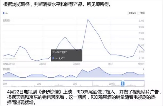 第一個例子,2014年四月份《步步驚情》電視劇上映,它里面有一款非常好的植入RIO雞尾酒,先看一下數(shù)據(jù)然后進行展開。