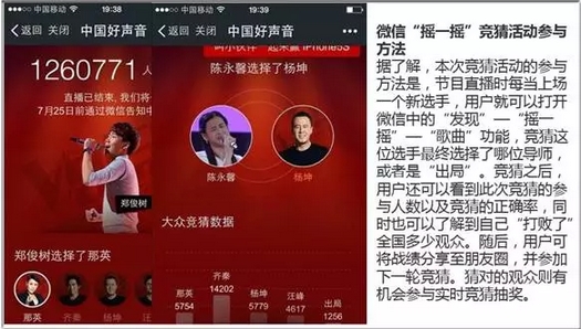 另一個案例就是騰訊做的關(guān)于中國好聲音的嘗試。2014年中國好聲音的獨播授權(quán)被騰訊拿到,對比初播,新鮮度顯然已經(jīng)過去。正在大家理所應(yīng)當(dāng)?shù)恼J(rèn)為好聲音的關(guān)注度會下降時,騰訊基于自身的社交基因,做了兩件讓人欽佩的事情。第一件事就是讓每個用戶參與進來,讓落選的歌手重新返場,這些返場的歌手由關(guān)注中國好聲音公眾號的用戶投票選出;第二件事就是做的非常準(zhǔn)確的臺網(wǎng)互動。當(dāng)電視臺出現(xiàn)上場歌手的時候,線下用戶可以通過微信來預(yù)測這位歌手會得到哪位導(dǎo)師的青睞,他會選哪一位導(dǎo)師。我們看下這兩張圖片。
