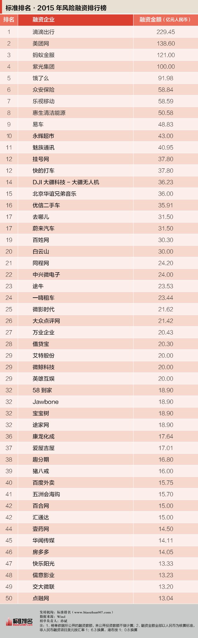 【標(biāo)準(zhǔn)排名】2015年風(fēng)投追捧的50家公司 坐滴滴吃美團