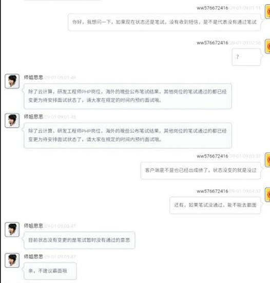 洪羽是電子商務(wù)專業(yè)大四的學(xué)生,參加阿里巴巴校招經(jīng)過了筆試正在等結(jié)果。她最開始得知“縮招”的消息還是從幾個(gè)分享群里。暑期在加拿大實(shí)習(xí)的洪羽一早起床發(fā)現(xiàn)自己加的幾個(gè)分享群都已經(jīng)吵翻了天。這時(shí)大家都在等待筆試結(jié)果發(fā)布、預(yù)約下一步面試的節(jié)點(diǎn)上,阿里招聘官網(wǎng)上卻突然發(fā)布縮招通知,緊接著就有同學(xué)在客服那證實(shí)了消息,并被告知除了技術(shù)類崗位,“網(wǎng)申頁面狀態(tài)仍停留在筆試階段就意味筆試沒通過”。