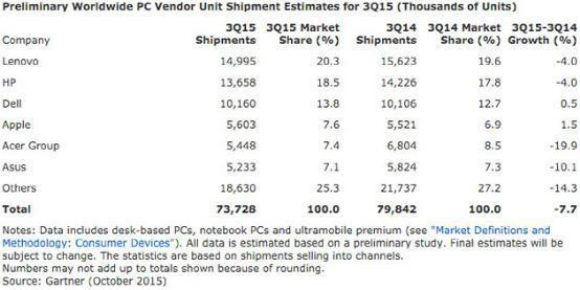 根據(jù)Gartner的數(shù)據(jù),2015年第三季度,聯(lián)想PC銷量略低于1500萬臺——市場份額為20.3%,再次蟬聯(lián)PC市場冠軍,但銷量同比降低4%。銷量同樣降低4%的還有惠普,1370萬臺的銷量使得其獲得了18.5%的市場份額。除蘋果外,戴爾是前六大PC廠商中市場份額唯一增長的廠商,1020萬臺的銷量使得戴爾市場份額增長了0.5個百分點。