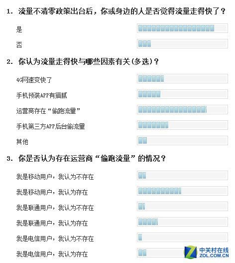 確實,編輯問過身邊不少朋友,也有不少覺得最近流量確實跑得快,甚至以往夠用整月的套餐僅僅半月就用光,只好繼續(xù)單獨購買流量。對此大家也并沒有深究到底,畢竟運營商目前處于壟斷地位,要么認栽,要么別用。對此我們ZOL也近期展開了一次調(diào)查,結(jié)果令人大吃一驚,參與調(diào)查的一萬多名網(wǎng)友中,認為“政策出臺后,流量跑得快了”的網(wǎng)友居然高達85%。