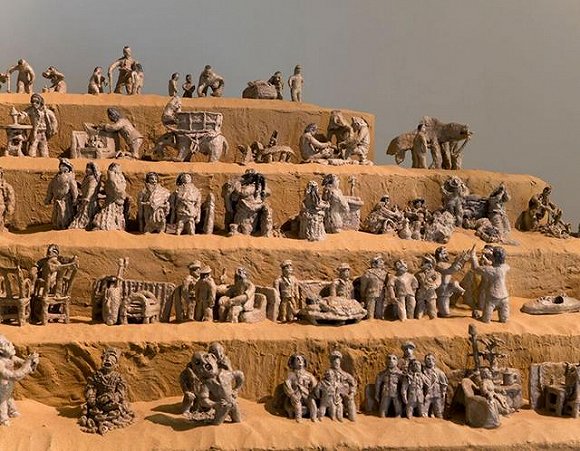 “重新定義中國藝術(shù)家?!辈虈鴱?qiáng)引用《紐約時(shí)報(bào)》最近對他的一篇報(bào)道說。這次歷時(shí)三年構(gòu)思的展覽顯示出他眼光的獨(dú)到之處——當(dāng)你走進(jìn)阿爾里瓦克展覽館,首先看到的是500尊泥塑,這是農(nóng)民藝術(shù)家胡志軍的《泥塑中國當(dāng)代藝術(shù)史》。胡志軍當(dāng)了一輩子農(nóng)民,幾年前,他的妻子——那個(gè)16歲就跟他戀愛的女人病故,他很痛苦,2013年開始捏起泥人來。蔡國強(qiáng)吃驚地發(fā)現(xiàn),胡志軍捏的上千個(gè)小人里有五花八門的性愛姿勢,飽含這個(gè)64歲男人對妻子的懷念。