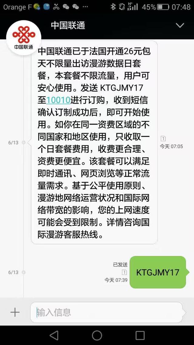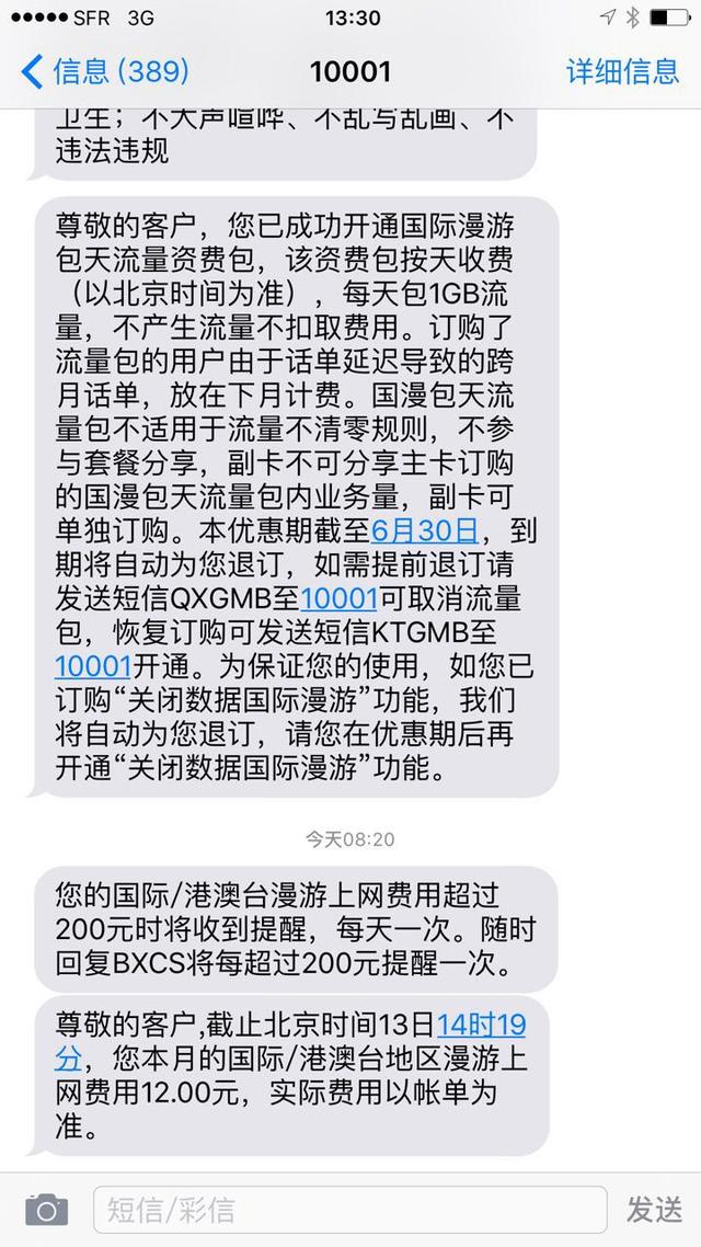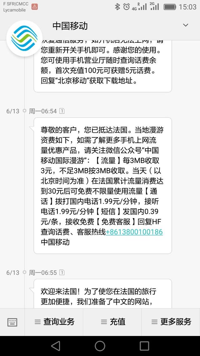 據(jù)了解,中國(guó)移動(dòng)在法國(guó)的漫游資費(fèi)是:語(yǔ)音方面,撥打、接聽國(guó)內(nèi)電話1.99元/分鐘,發(fā)短信0.39元/條,接收免費(fèi);數(shù)據(jù)流量方面,每3MB收取3元,不足3MB按3MB收取,當(dāng)天(以北京時(shí)間為準(zhǔn))在法國(guó)累計(jì)流量消費(fèi)達(dá)到30元后可免費(fèi)不限量使用流量。